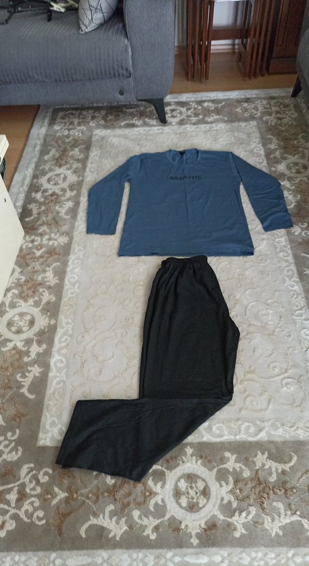 Erkek pijama takımı, bol kesim ve uzun kollu tasarıma sahip. Gri-mavi üst ve siyah uzun pantolonla rahat ve şık bir görünüm sunar.