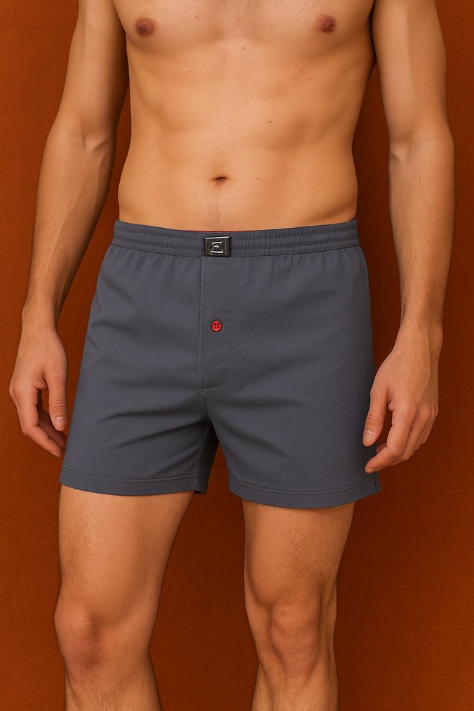 Gri renkte, kısa boylu ve sade desensiz Düğmeli erkek boxer şort,tarz için uygundur. (BEDENLERİ VE RENKLERİ LUTFEN SORUNUZ )