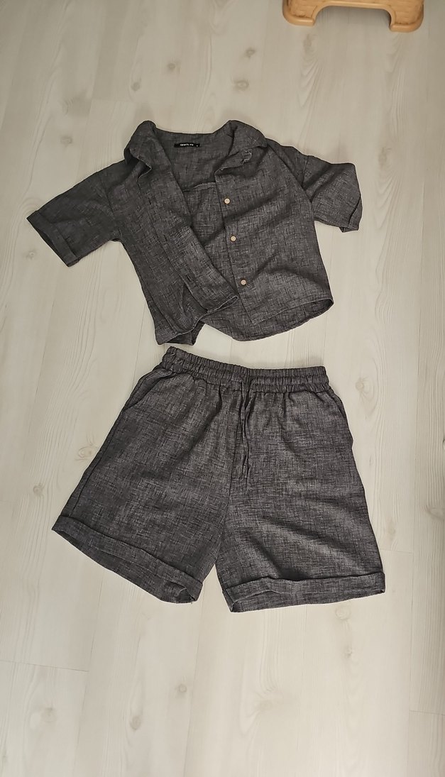 Erkekler için gri renkte, kısa kollu, düğmeli ve notalı yaka detaylı, bol kesim mini pijama takımı.
