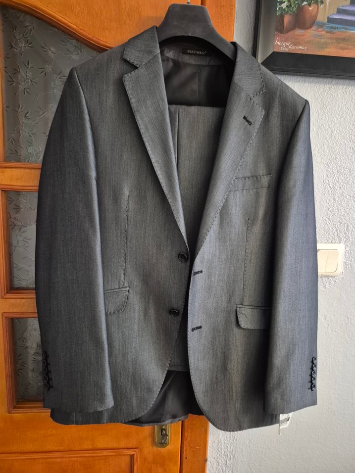 Düğmeli, uzun kollu, gri erkek ceket; klasik ve modern tarzda, ofis için uygun, normal kesim ve kesim detayları ile.1 kere giyildi yeni sayılır