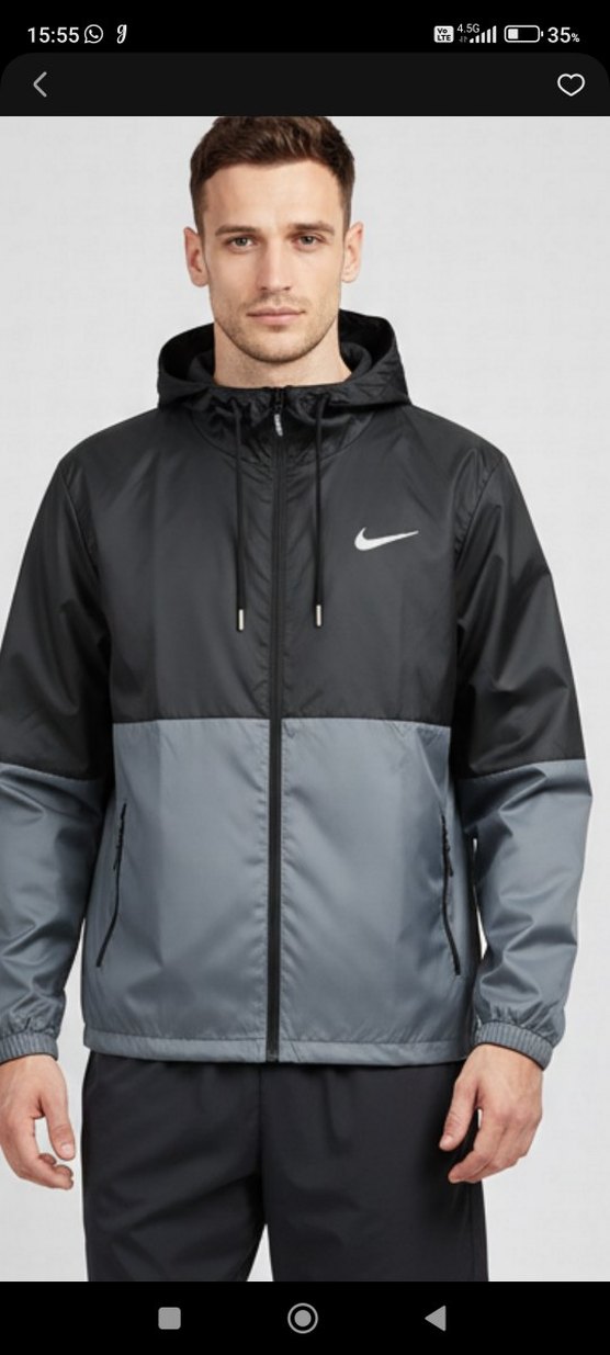 Erkekler için gri Nike mevsimlik, yüksek yakalı ve fermuarlı. Uzun kollu, kapüşonlu ve sentetik kumaştan yapılmıştır. S,M,L,XL,2XL