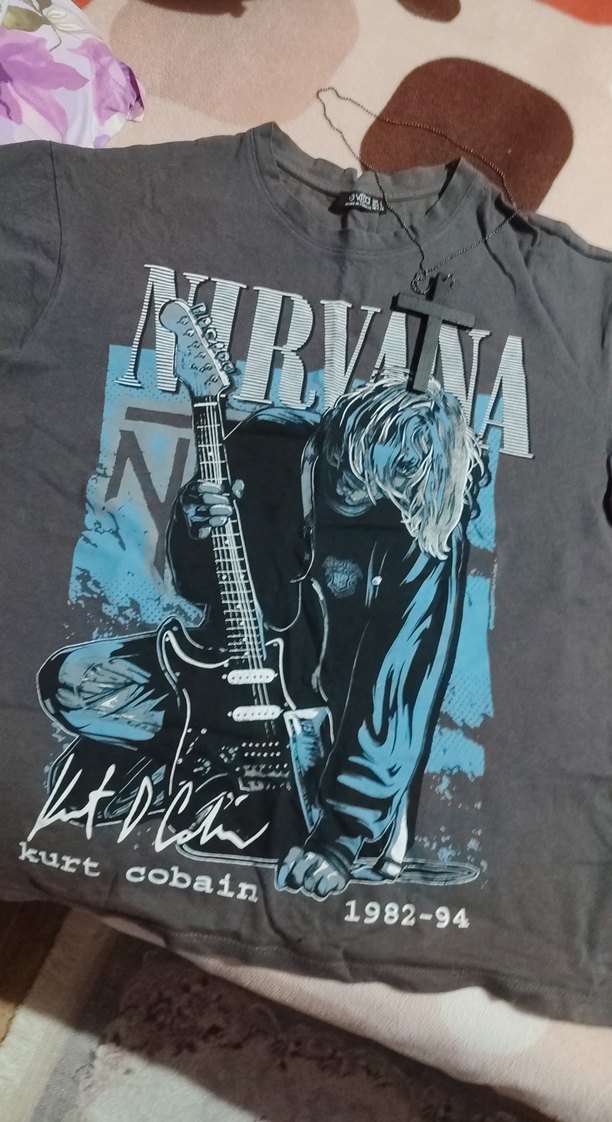 Gri renkli, kısa kollu, rahat kesim erkek tişörtü. Denim kumaştan üretilmiş, Nirvana ve Kurt Cobain baskılıdır. m-l uygun etikette xs diyor fakat baya rahat ve büyük kalıp. unisex tshirt defosu önünde ona göre fiyatı uygun tutucam alt kısmını kesip kullanabilirsiniz