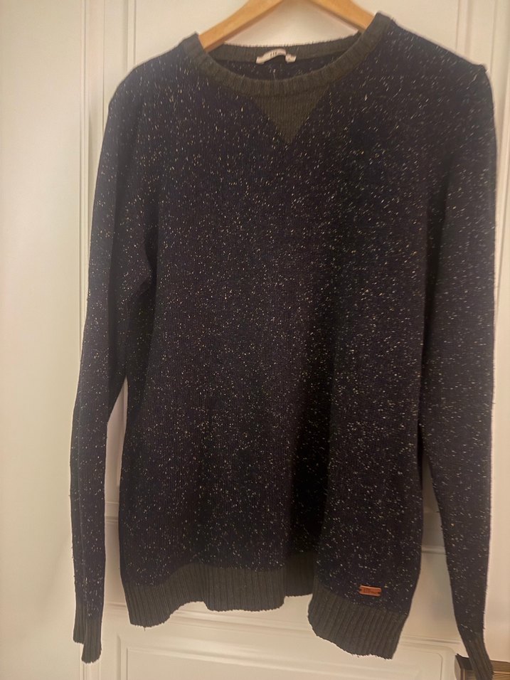 Erkekler için uzun kollu, bisiklet yaka ve bol kesim yün örgü kazak. Koyu gri renkte, rahat sokak stili için uygundur.