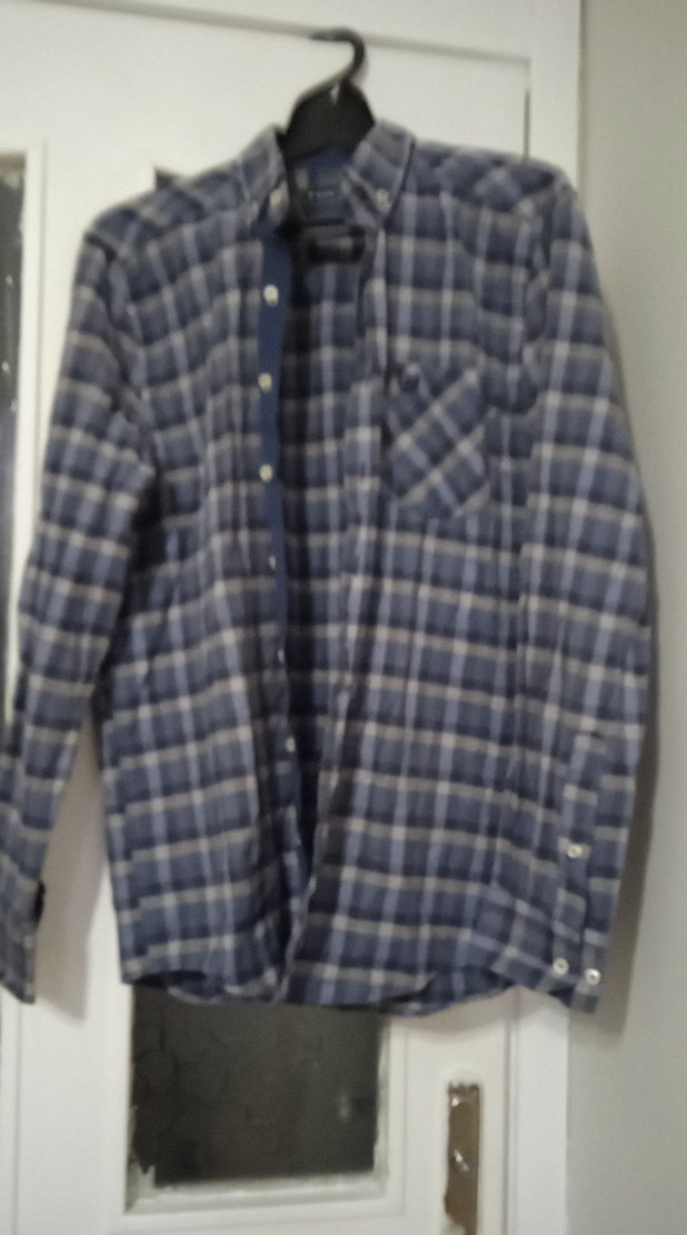 Pamuklu kumaştan yapılmış, düğmeli ve uzun kollu gri erkek gömleği. Normal kesim ve kesik yaka detayına sahip, günlük sokak stiline uygun. kullanılmış