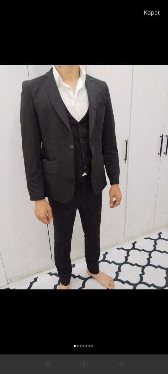 Erkekler için regular fit, düğmeli ve çentikli yakalı koyu gri takım elbise. Ofis ve günlük sokak stili için uygun.