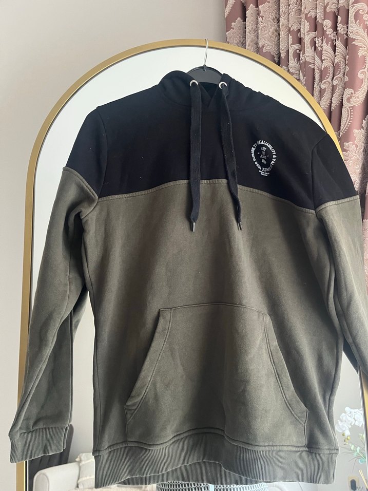 Erkekler için gri ve siyah renkte, fermuarlı, baskılı desenli, uzun kollu, yuvarlak yakalı, bol kesim sweatshirt. Sokak stiline uygun, rahat ve sıcak kumaşlı.