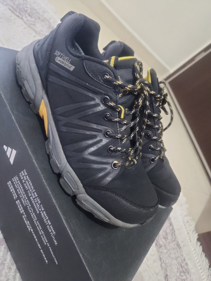 Gri ve sarı renkli, baskılı desenli, kauçuk tabanlı ve bağcıklı erkek outdoor spor ayakkabısı.