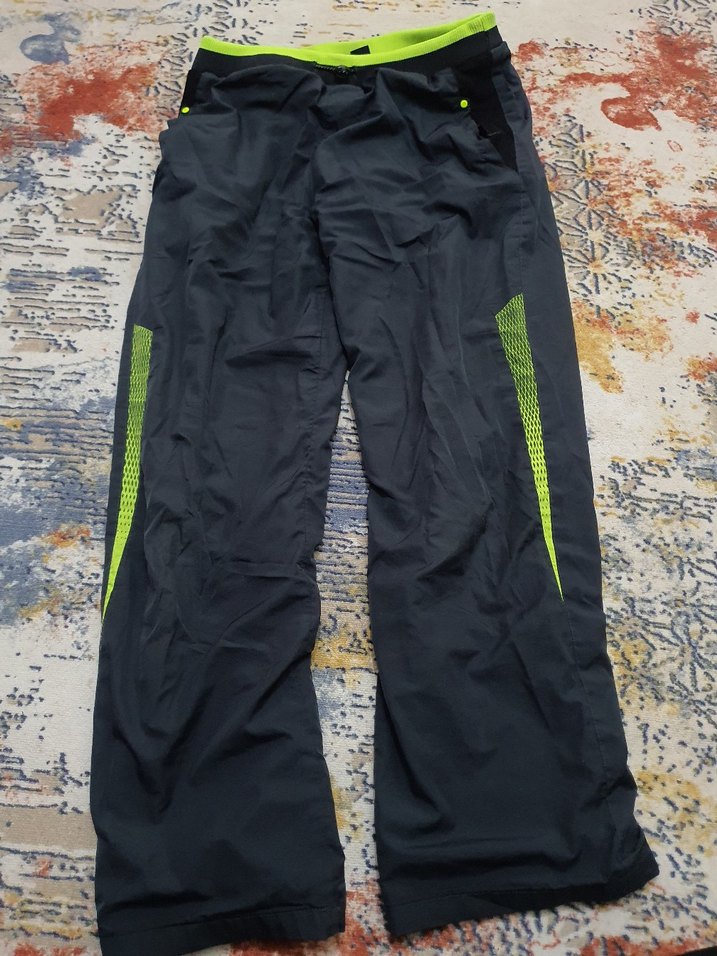 Gri renkli, neon yeşil detaylı, sentetik kumaştan erkek outdoor eşofman. Rahat kesim, fermuarlı cepler ve midi boyda, spor ve günlük kullanım için uygun. ♂️