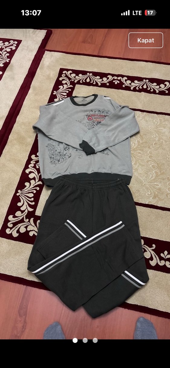 Erkekler için gri, baskılı, bol kesim sweatshirt ve beyaz şerit detaylı siyah eşofman altı. Yumuşak ve sıcak kumaştan üretilmiştir.