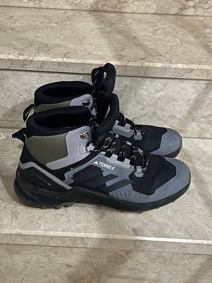 Gri renkli, bağcıklı Terrex erkek outdoor ayakkabısı, spor ve sokak tarzı için uygun. Rahat ve dayanıklı kauçuk tabanlı. Son fotoğraflarda görülen yapıştırma işlemi vardır