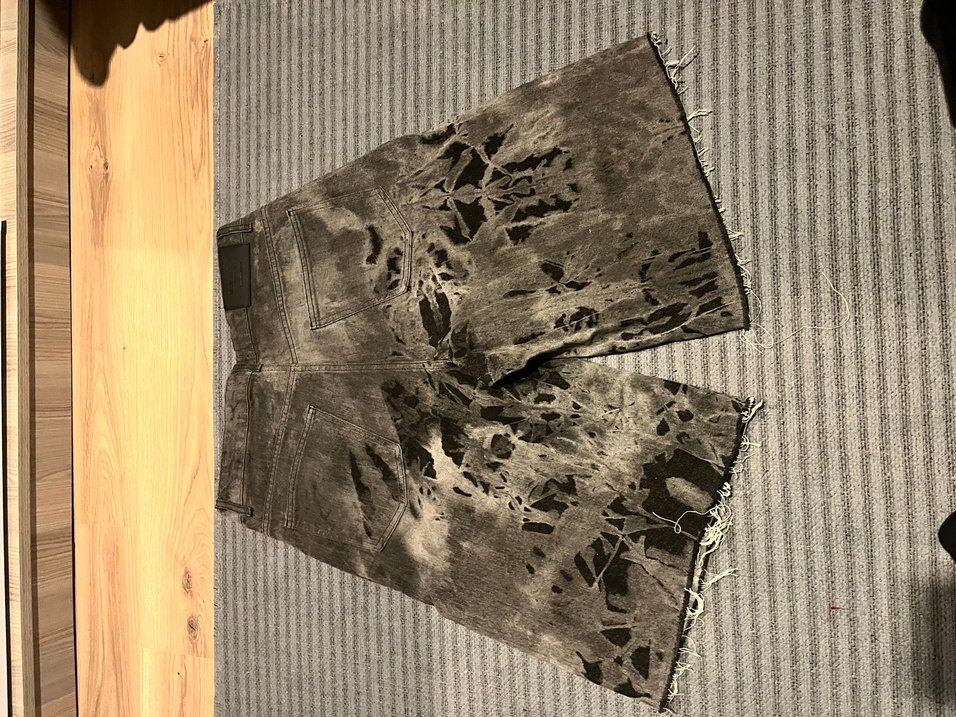 Gri tie-dye desenli, bol kesim ve kürk detaylı kot şort, grunge punk tarzında dış mekan sokak giyimi için uygun.