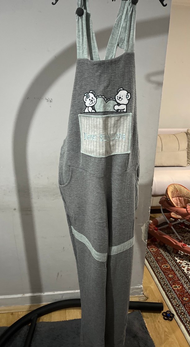Kadınlar için gri triko askılı tulum, bol kesim ve ön cepte baskılı ayı desenli. Yumuşak ve sıcak fleece kumaştan üretilmiştir.hamile tulumu