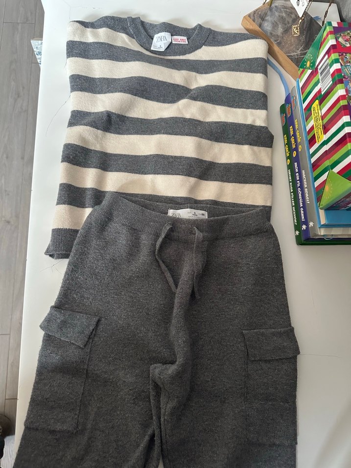 Erkek çocuklar için çizgili triko kazak ve cepli, bol kesim gri eşofman altından oluşan yumuşak yün kumaş set. Görseldeki takım gibi 3 yaş sadece bir kere giyildi