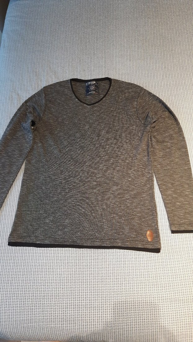 Erkekler için gri renkli, uzun kollu ve yuvarlak yakalı, rahat kesime sahip kazak.