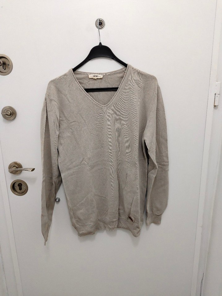 Erkekler için gri renkte, keten kumaştan yapılmış, V yakalı ve uzun kollu, rahat kesim kazak. Desensiz ve günlük kullanıma uygun.