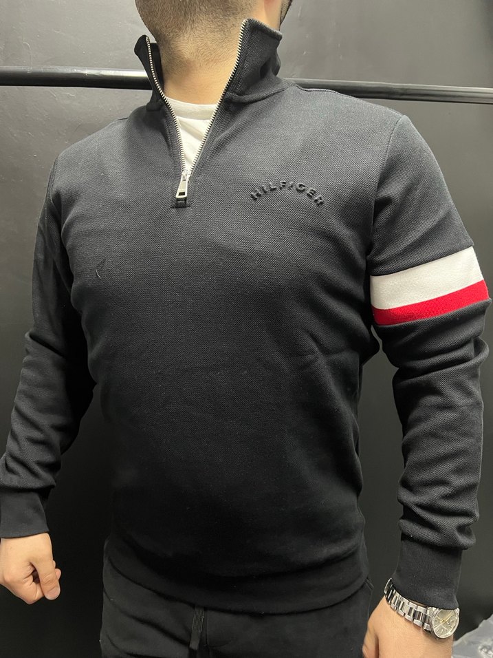 Fermuarlı yüksek yakalı, uzun kollu ve gri renkli bu dar kesim erkek sweatshirtü, kolunda kırmızı-beyaz şerit detayına sahiptir. Yumuşak kumaştan üretilmiş, günlük rahat kullanım için uygundur.