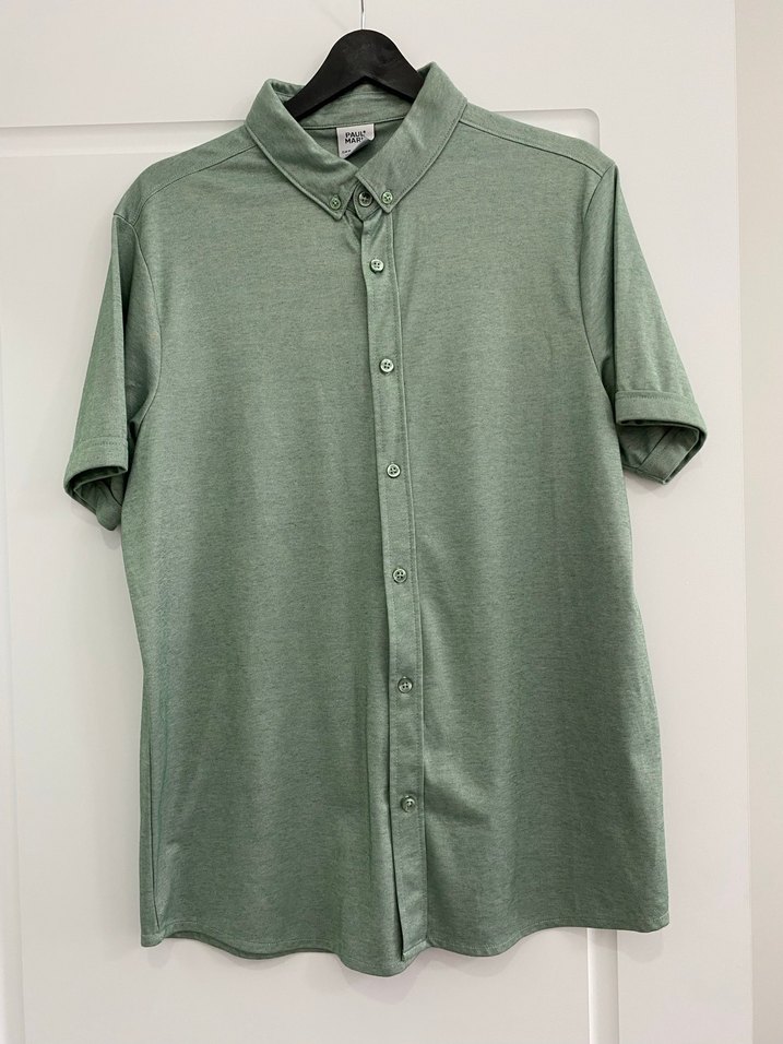 Düğmeli, kısa kollu ve yakalı erkek gömleği. Yumuşak sentetik kumaştan üretilmiş, rahat ve salaş kesim. yeşil tonlarında gündelik kullanım için uygun. Leke, sökük, yırtık yok. Taş çatlasın 4-5 kez giyildi.