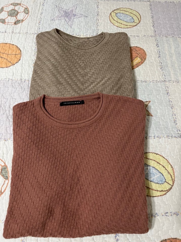 Kahverengi ve gri renklerde, yuvarlak yakalı ve uzun kollu iki erkek örgü kazak. Rahat kesimi ve normal boyu ile gündelik kullanıma uygundur.
