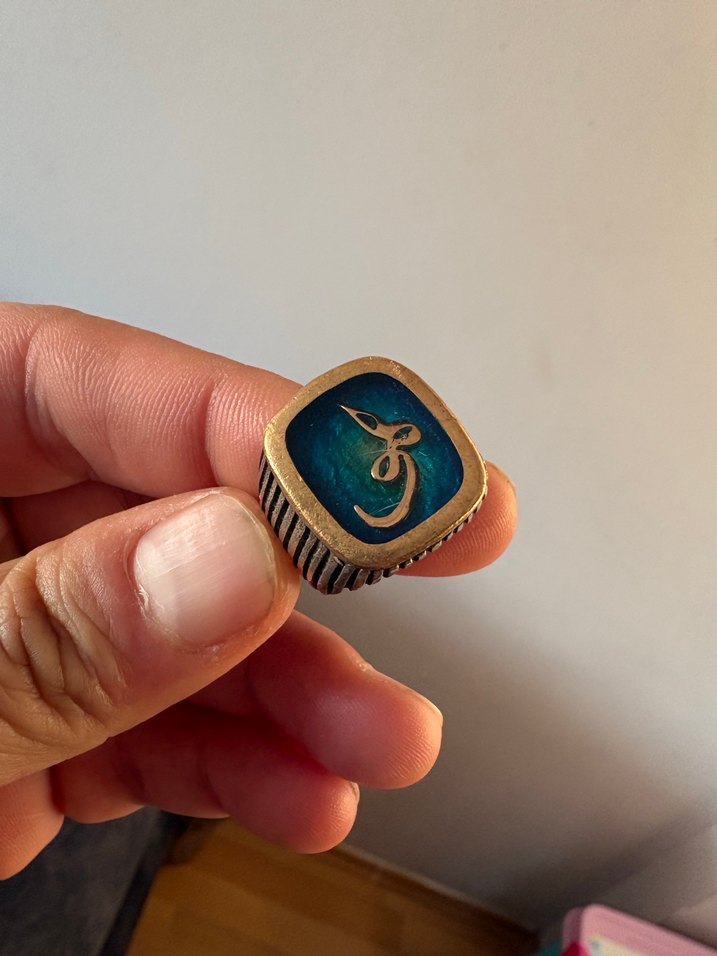 925 ayar orjinal gümüştür Vav sembollü şık bir yüzüktür ölçü 23 Parlak turkuaz taşlı, vintage tarzda sade ve karşı kültür etkili erkek yüzüğü. Gösterişsiz ama etkileyici bir tasarıma sahiptir.