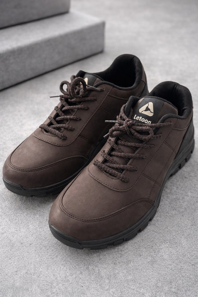 Erkekler için koyu kahverengi süetten yapılmış, bağcıklı günlük dış mekan ayakkabıları. Sokak giyimi ve athleisure tarzına uygun, desen içermeyen şık tasarım.