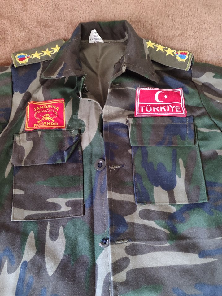Askeri tarzda haki ceket, omuzlarda yıldızlar ve 'TURKIYE' yazılı rozetler içerir. şapka pantolon kemer mevcut