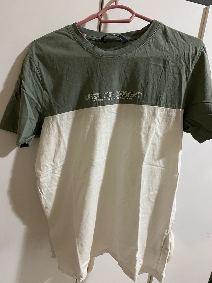 Erkek tişörtü, bol kesim, kısa kollu ve bisiklet yakalıdır. Üst kısmı haki, alt kısmı beyazdır ve baskılı slogan içerir. Pamuklu rahat kumaştan üretilmiştir.
