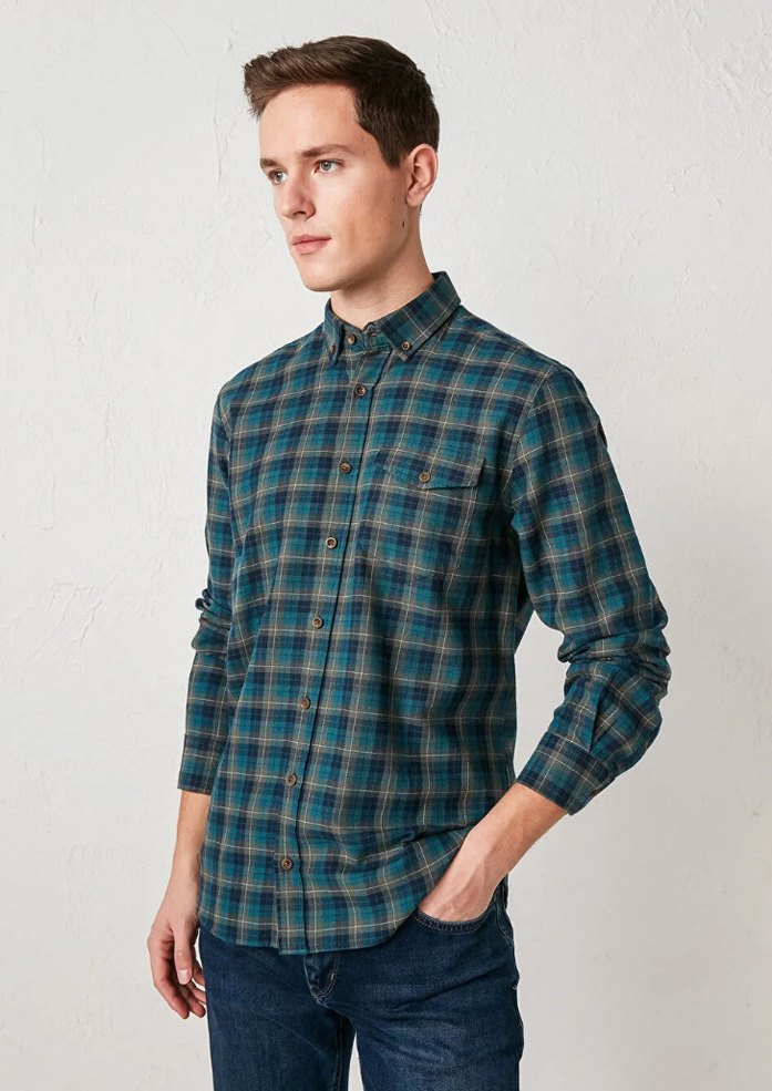 Erkekler için regular fit, uzun kollu ve düğmeli haki renkli gömlek. Pamuklu yumuşak kumaştan, günlük rahat kullanım için uygundur.