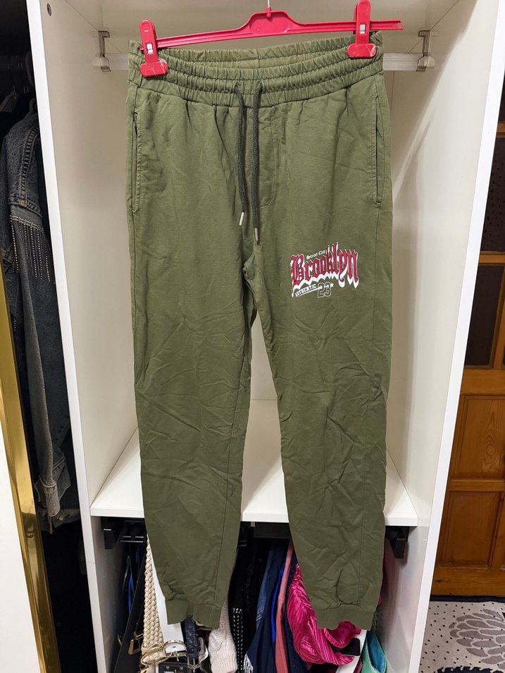 için koyu haki renkli, pamuklu, bol kesim ve normal boyda, fermuarlı cepler ve nakış detaylarına sahip eşofman. Spor ve rahat sokak stili için uygundur.