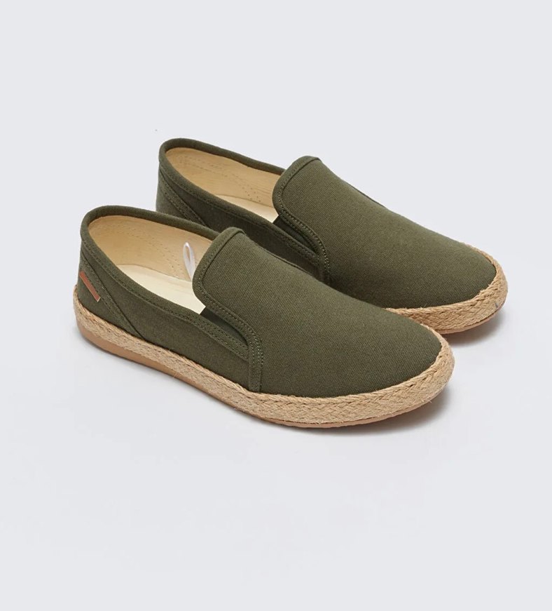 Erkekler için haki renkli, kauçuk tabanlı, desensiz espadril. Günlük kullanıma uygun, zahmetsiz şıklık sunar. Normcore tarzda rahat ayakkabı. 44 numara