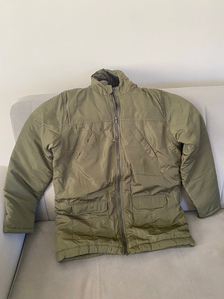 Erkek mont, fermuarlı ve ince kesimdir. Midi uzunlukta, yakası kesik ve uzun kolludur. Yumuşak, sıcak kumaştan yapılmış haki renkte, günlük ve rahat kullanıma uygundur.