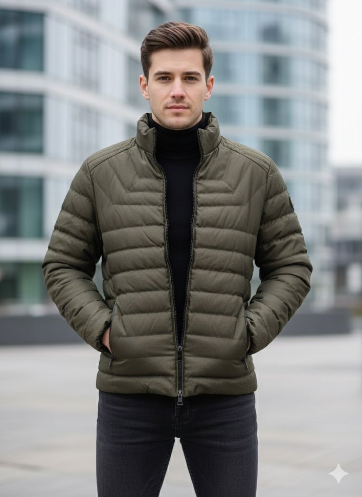 Erkekler için haki renkli, fermuarlı, midi boy, uzun kollu ve regular fit street style mont. Sıcak tutan yumuşak kumaştan üretilmiştir.