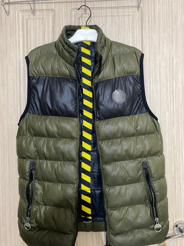 Erkekler için yüksek yakalı, fermuarlı ve fitted kesim haki kamuflaj desenli yelek. Sentetik kumaştan, günlük sokak stili için uygun.