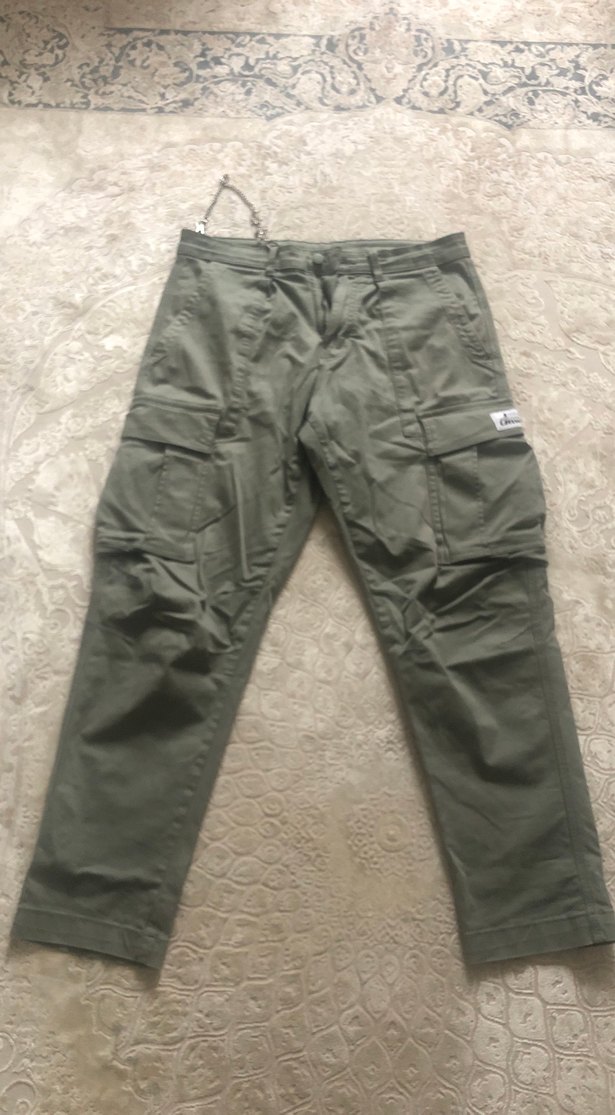 Erkekler için haki kamuflaj desenli, pamuk kumaştan, bol kesim kargo pantolon. Rahat ve şık, dış mekan için uygun.bel 42 cm boy 98 cm