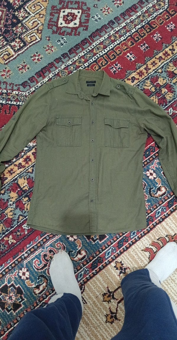 Pamuk kumaştan yapılmış, uzun kollu ve yakalı erkek gömleği. Düğmeli ön ve göğüs cepleriyle günlük rahat kullanıma uygun, bol kesim ve koyu haki kamuflaj desenli.