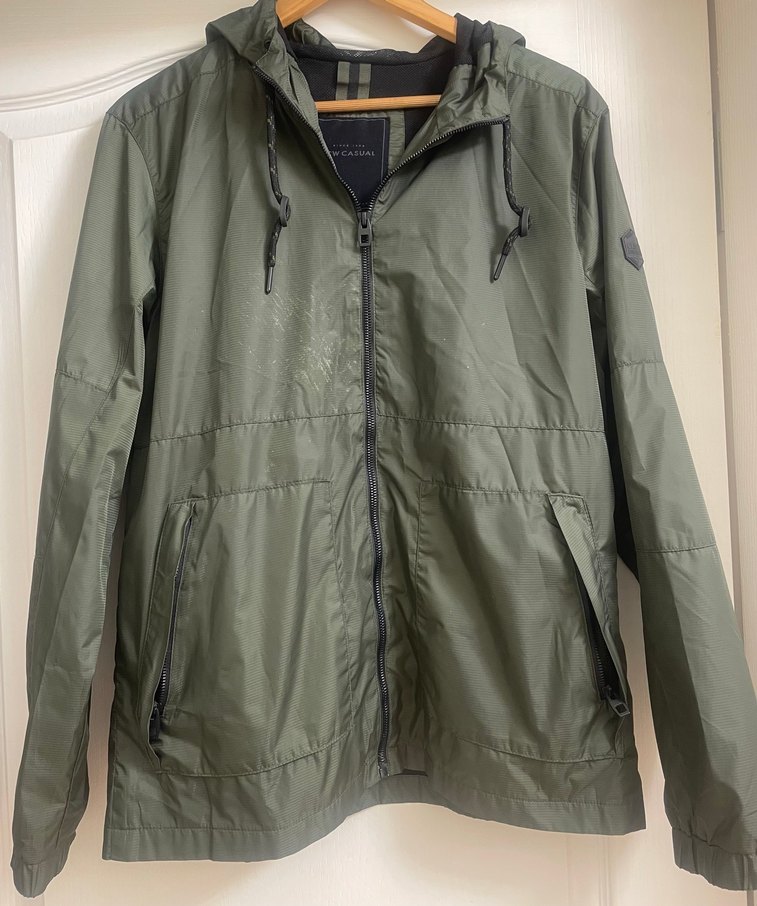 Erkekler için kapüşonlu, fermuarlı ve haki renkte sentetik kumaştan yapılmış bol kesim ceket. Uzun kollu ve midi boyda, günlük dış mekan kullanımı için uygundur. İç kısmı file detaylı yanlarda cep mevcut ön kısmında çok az lekesi vardır