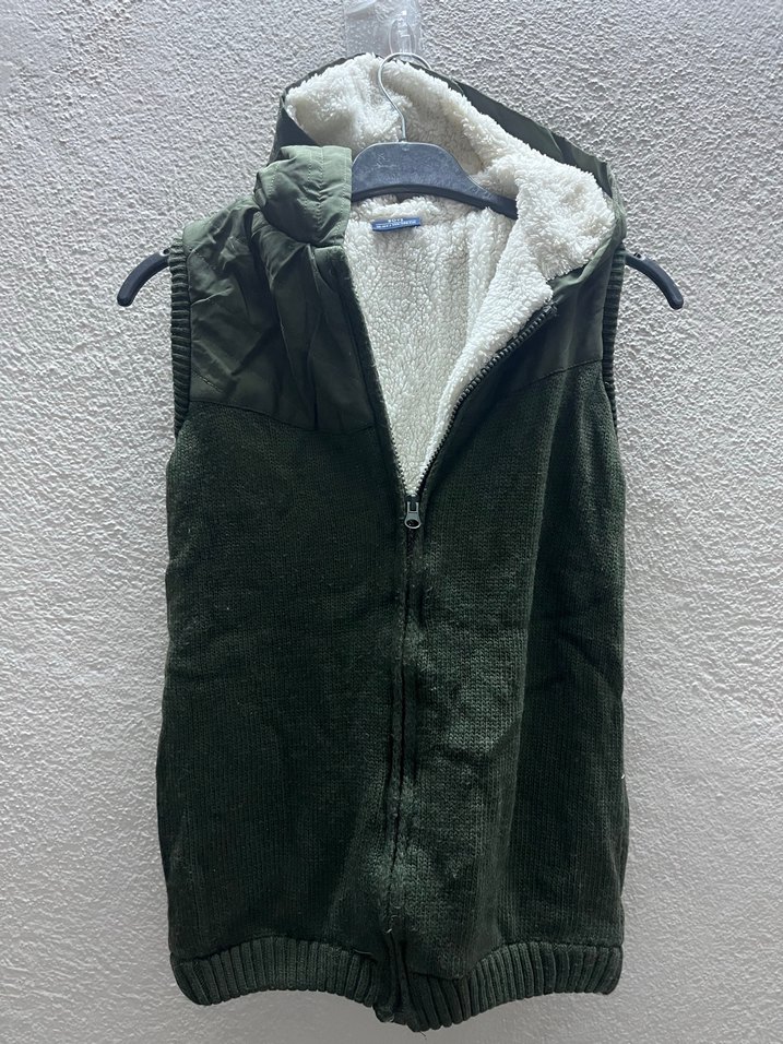 Yüksek yakalı, fermuarlı, kolsuz erkek yeleği, yumuşak ve sıcak kumaştan üretilmiş, bol kesimdir. Düz haki renkte, günlük sokak tarzına uygundur. İçi yünlü olduğu için oldukça sıcak tutar sorunu yoktur
