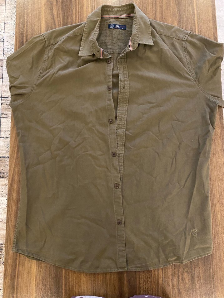 Nefes alabilen keten kumaştan yapılmış, haki renk, kısa kollu ve kesik yaka detaylı bol kesim erkek gömleği. Rahat sokak stili için uygundur.