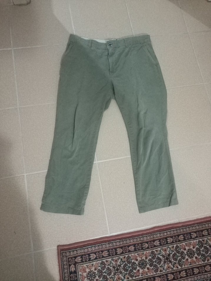 Haki renk keten kumaştan, normal 38x34boy ve rahat kesime sahip, günlük kullanım için uygun şık erkek pantolon. sadece arka ufak bir yerinde yırtık var