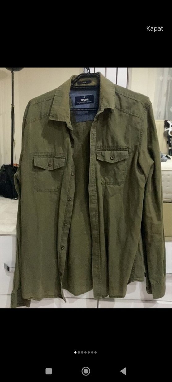 Erkekler için düğmeli, uzun kollu, keten kumaştan yapılmış haki renkli gömlek. Regular fit kesimi ve çıtçıtlı cep detaylarıyla günlük rahat kullanım için uygundur.