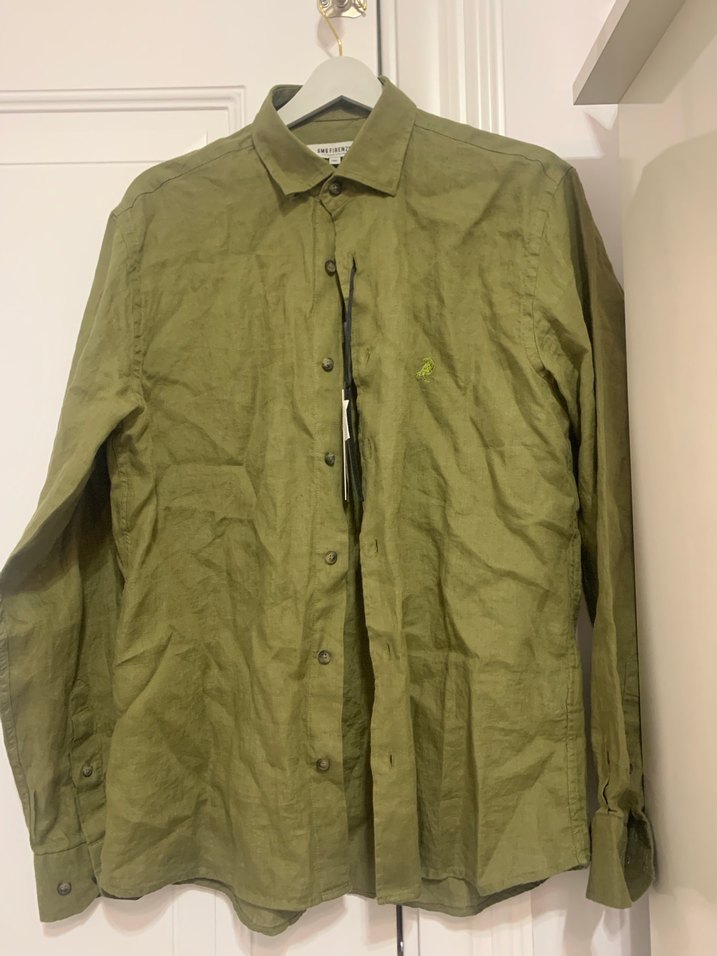 Erkekler için uzun kollu, çıtçıtlı, parlak haki keten gömlek. Normal kesimli, ofis ve günlük sokak stiline uygun.