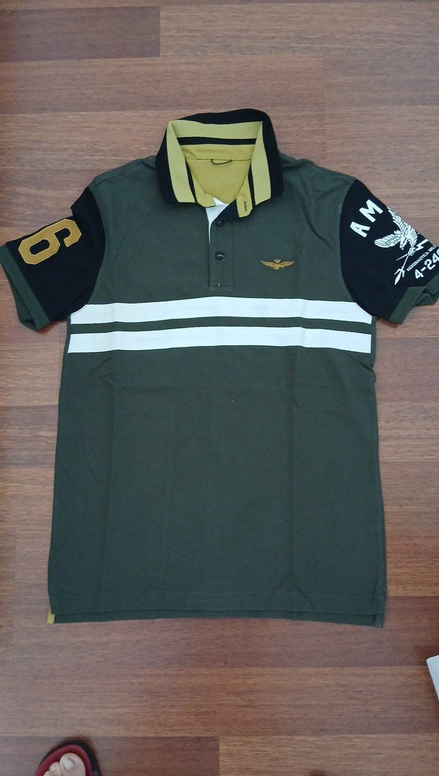 Düğmeli yakalı, kısa kollu, regular kesim erkek polo tişört. Koyu haki renk ve beyaz çizgili baskılı tasarıma sahip, sentetik yumuşak kumaştan üretilmiştir.