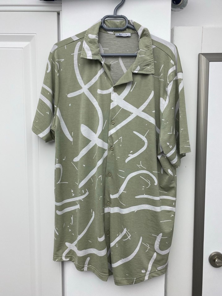 Kısa kollu, yakalı ve düğmeli erkek gömleği. Haki renkli ve gri batik desenli, salaş kesim, günlük sokak stiline uygun.