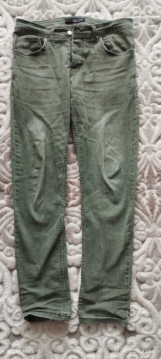 erkek haki renkli, düğmeli ve normal boyda denim pantolon, günlük rahat kullanım için uygundur.