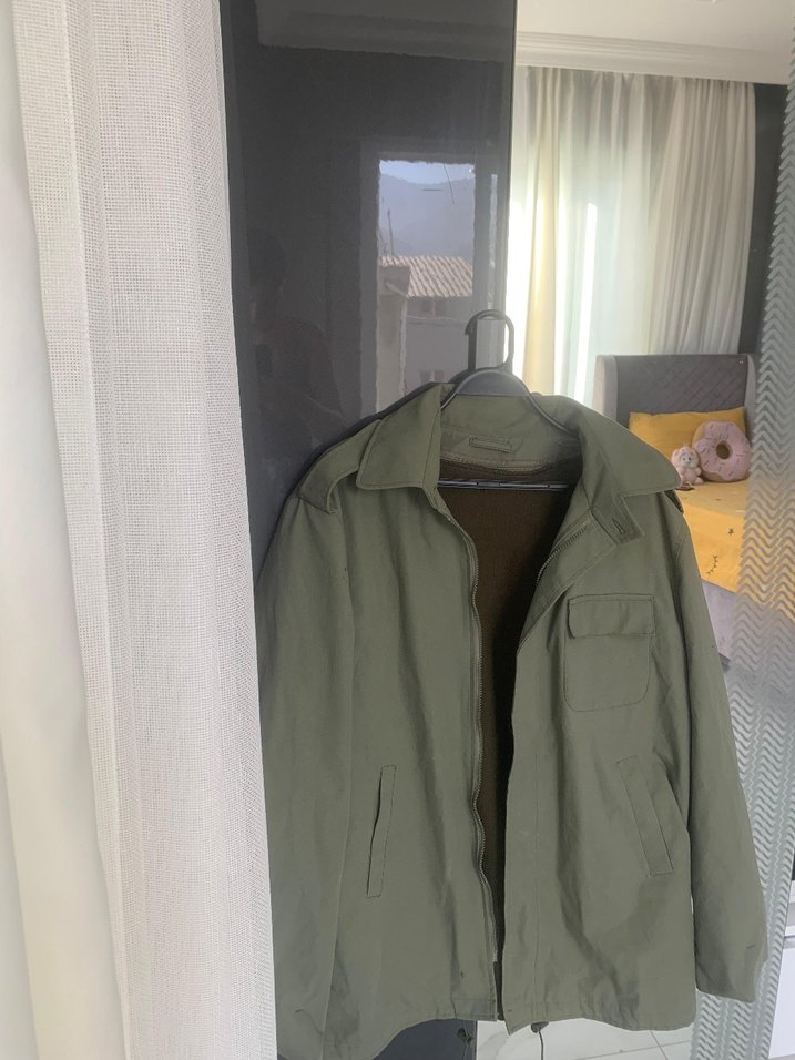 Erkekler için haki midi ceket, düz kesim, uzun kollu ve kesik yaka detaylıdır. Sentetik kumaştan üretilmiş, fermuarlı ve minimalist kamuflaj desenlidir.