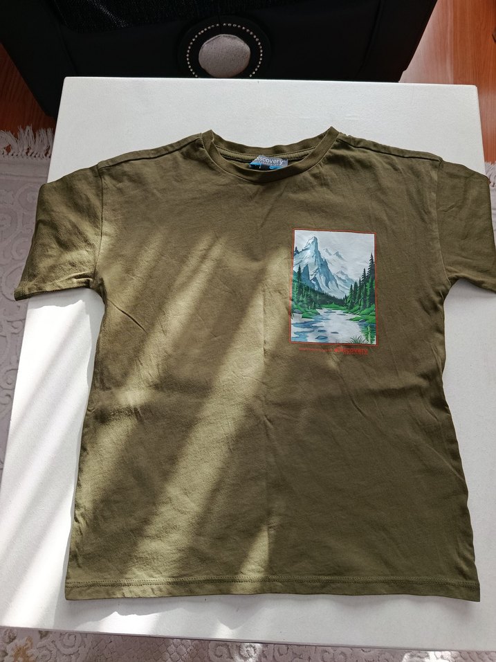 Bu erkek haki pamuk tişört, yuvarlak yaka ve kısa kolludur. Rahat kesimi ve önünde baskılı doğa deseni bulunur, günlük dış mekan kullanımı için uygundur yeni gibi renk ilk günkü gibi
