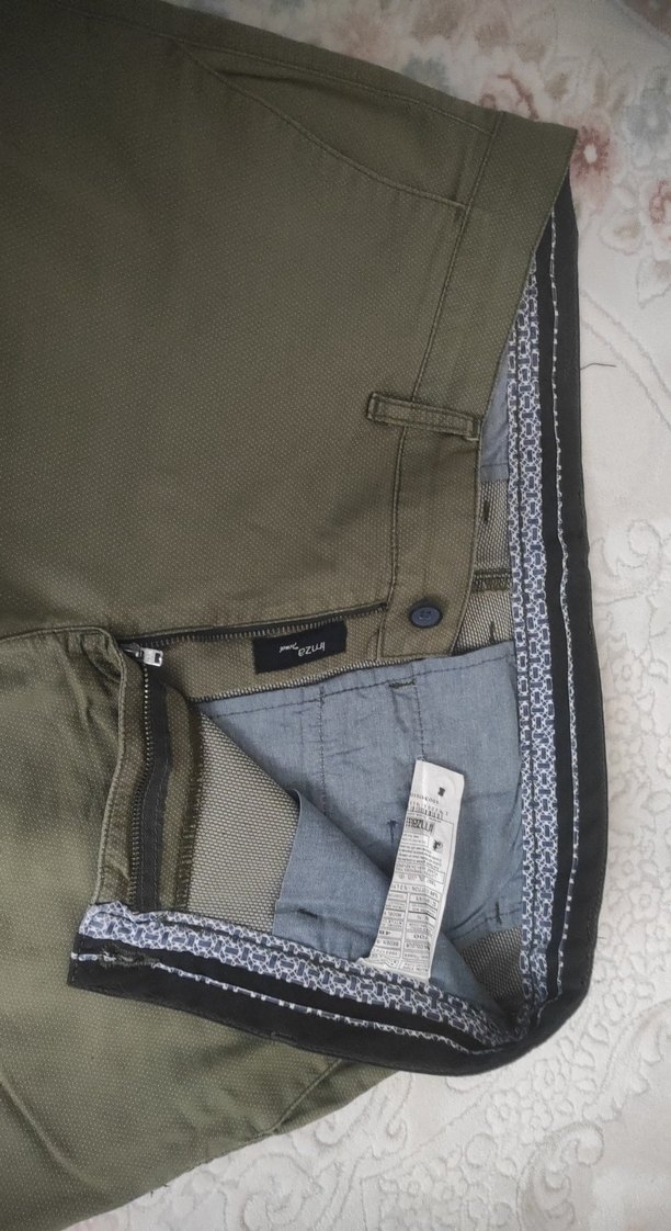 Erkekler için haki renk, kemerli, regular fit ve normal boy pantolon. Düz ve desen içermeyen tasarımıyla günlük ve sokak stili için uygundur.
