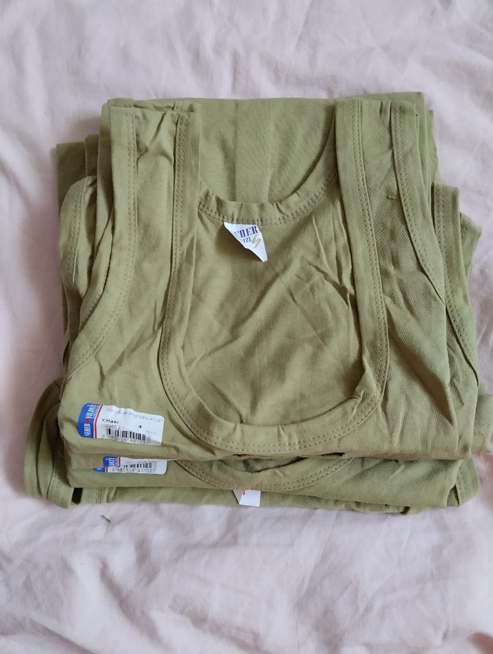 Hafif haki renkte, desen içermeyen yumuşak kumaştan atlet. 4adet sıfır ürün..