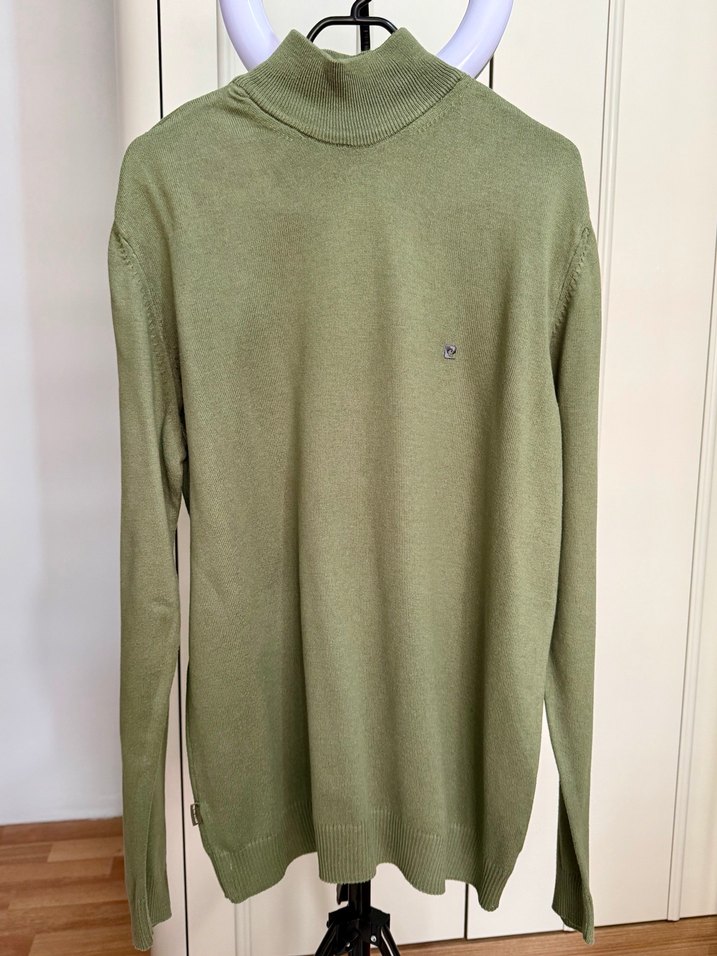Erkekler için boğazlı, uzun kollu, pastel yeşil renkli, keten kumaştan örme triko kazak. Rahat ve bol kesim, günlük kullanıma uygun.