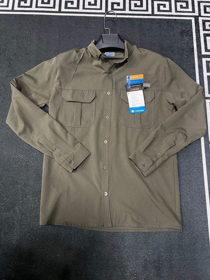Erkek haki renkli, uzun kollu, düğmeli ve yakalı gömlek. Sentetik kumaştan, baskılı desene sahip, rahat kesim ve günlük dış mekan kullanımı için uygun.
