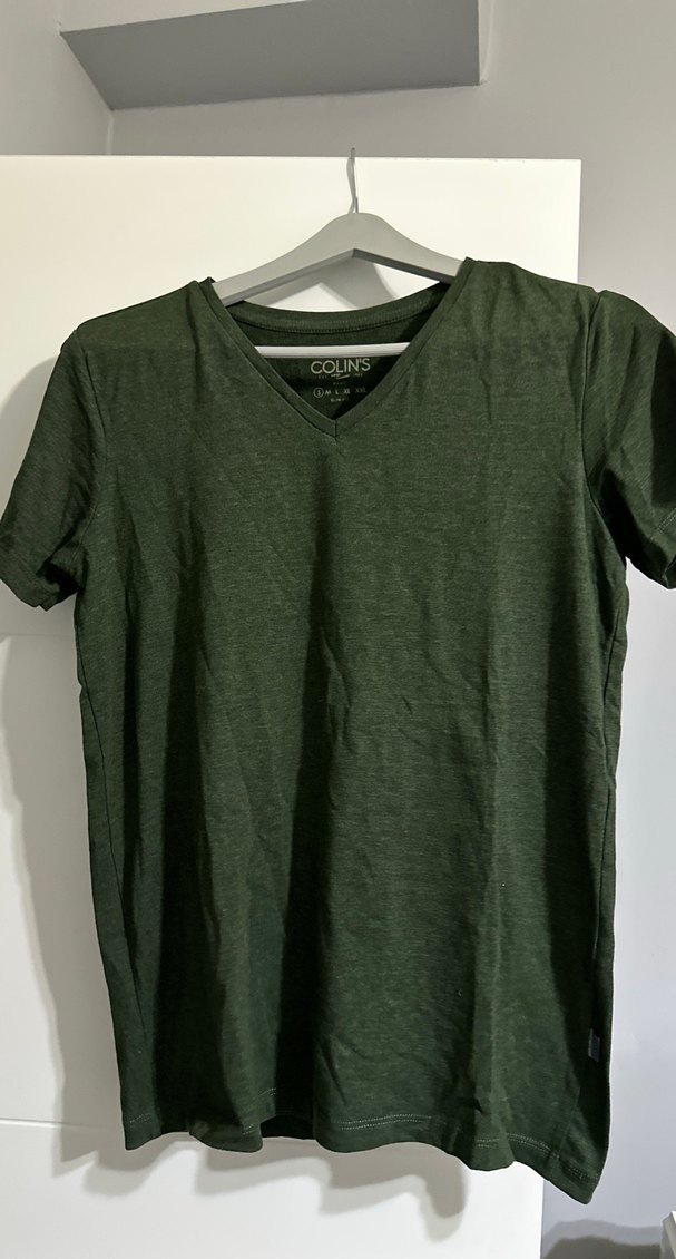 Erkekler için loose fit, haki renkli, V yakalı, normal boyda, rahat kesim tişört. Yumuşak kumaştan üretilmiştir.